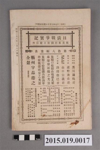 本編為此系列之第17編,本版為初版。每月發行三回,費用為1錢5厘,第1-20編封面皆相同。攻陷威海衛,放逐請和使,征清戰局日益雄大。內容有:口繪(圖版)、 戰爭實記、史傳、地理、文苑、軍人逸話、軍事叢譚、海外評論(英國、美國、支那)、國論一斑、戰事公報、戰事通信、海外彙報(英國、法國、義大利、美國、瑞士、朝鮮、支那)、海內彙報。