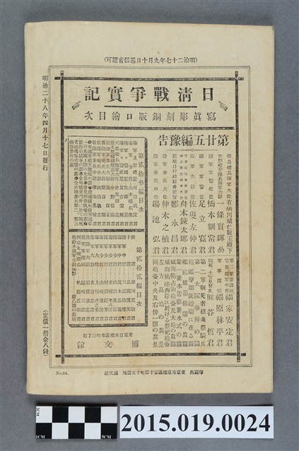 本編為此系列之第24編,本版為初版。每月發行三回,費用為1錢5厘,第21-50編封面皆相同。封面有:看阿!看牛莊的市街戰,田庄臺的燒擊如何激烈迅疾!內容有:口繪(圖版)、戰爭實記、史傳、地理、文苑、軍人逸話、軍事叢談、海外評論(英國、法國、美國)、戰事公報、戰事通信、海外彙報(美國、德國、俄國、美國、朝鮮、支那)、海內彙報。