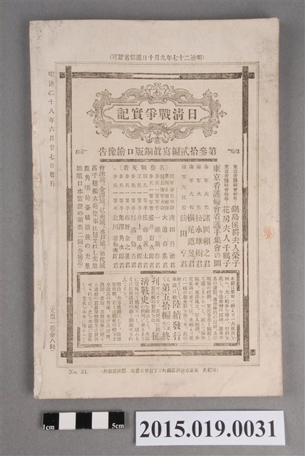 本編為此系列之第31編,本版為初版。每月發行三回,費用為1錢5厘,第21-50編封面皆相同。封面有:本編起記事面目一新,五十編完結。內容有:口繪(圖版)、廣告、戰爭實記(臺灣接受完畢、臺灣綏撫續記雞籠(基隆)鎮定之書信、臺灣接收別報、正式讓與臺灣)、勳功美談、最近電報(臺灣近事)、戰爭文學、東洋風土(臺灣事情四)、外交史談、海外戰史、軍事叢談、軍人餘譚、戰後經濟、海外評論、國論一斑(臺灣的形勢、臺灣的施政)、海外時事、海內時事。