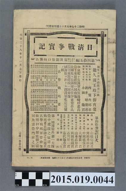 本編為此系列之第44編,本版為初版。每月發行三回,費用為1錢5厘,第21-50編封面皆相同。封面有:劉永福已無戰之勇,又拒絕投降,終於失蹤,何等醜態。內容有:口繪(圖版)、戰爭實記(嘉義鎮定記、布袋嘴登陸拒絕劉永福投降、臺灣電報)、勳功美談、戰爭文學、東洋風土(彰化附近的地理、船乘見聞錄在嘉義布袋嘴)、外交史談、海外戰史、軍事叢談、軍人餘譚、戰後經濟、海外評論、國論一斑、海外時事、海內時事、征清戰史。