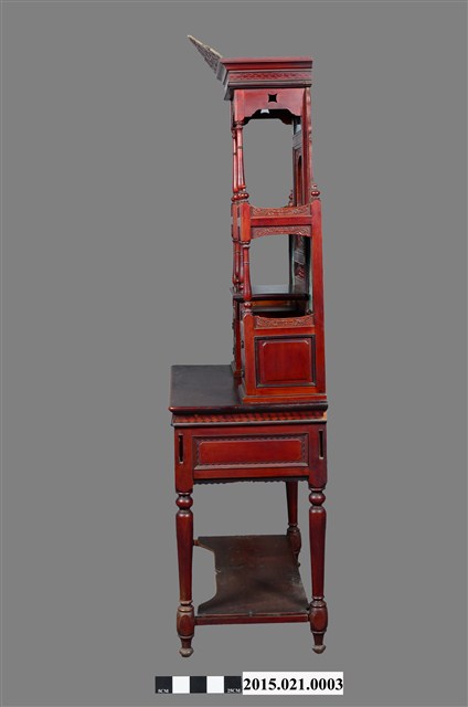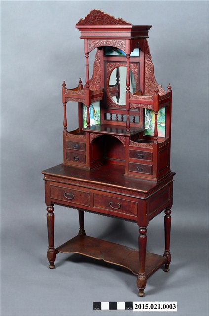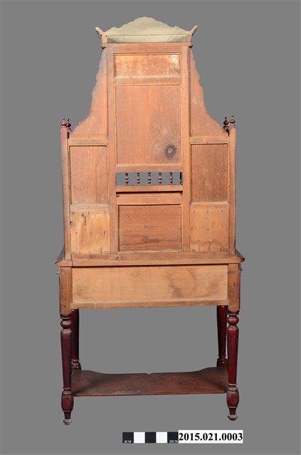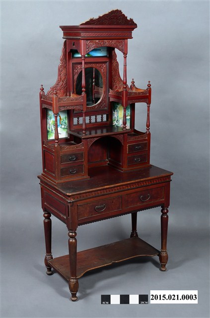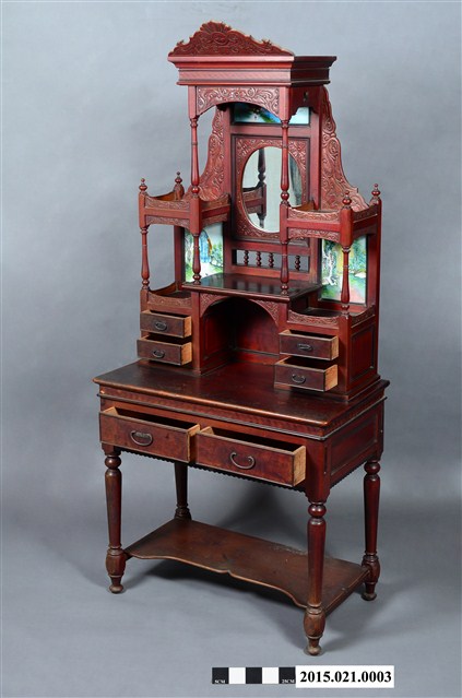 (2) 桌面板之上為高聳的大型鏡台,底層左右兩側各有一雙層胭脂水粉小抽屜,兩抽屜頂部間架橫板,形成鏡前置物小桌。左右抽屜各向上以兩支細車枳連結上方「捧盤」。捧盤上下兩面外沿以「柵仔」結合,表面以西洋花草文之淺浮雕裝飾。鏡臺中央(左右捧盤間)鑲一橢圓形照鏡,照鏡上方及左右斜下側(捧盤之下)鑲嵌彩繪玻璃,左右側之玻璃畫繪時裝仕女圖,上方玻璃畫為海岸風景畫。梳妝台頂部帶一「塔頭蓋」,塔頭蓋水車堵以貼木(或寄木)技法作菱形紋環繞裝飾,水車堵下裝飾西洋花草紋花柴。塔頭蓋頂裝飾星芒西洋花草紋斜籃花柴,為梳妝台增添許多華麗質感。