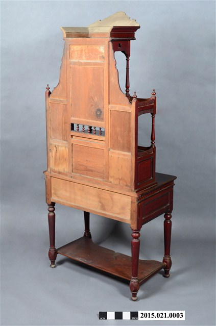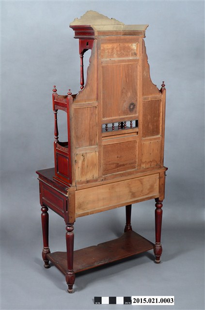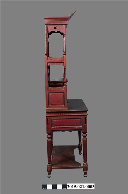 2. 本件梳妝台屬日治時期台灣中部豐原地區風格,外型高聳,裝飾華麗,面寬88公分,全高197.5公分,縱深48公分,通體施朱漆。梳妝台以桌面為基準分成上、下兩部分: