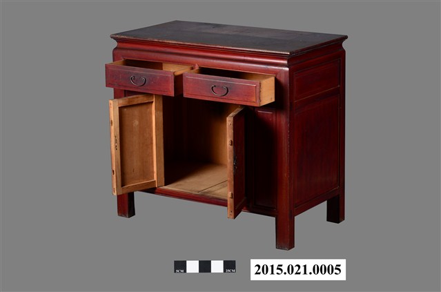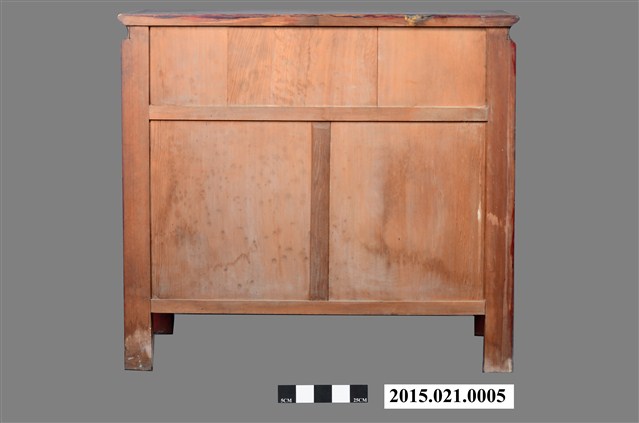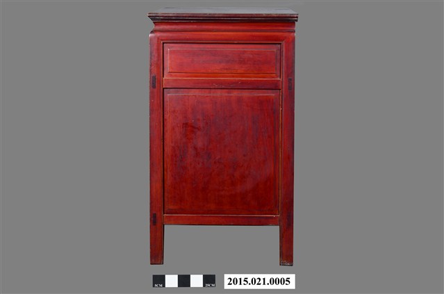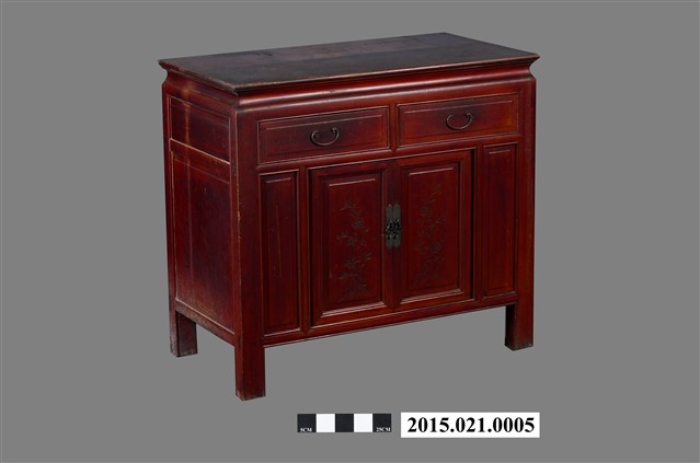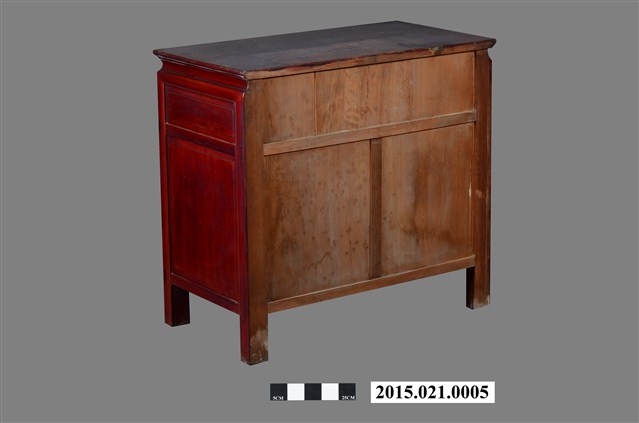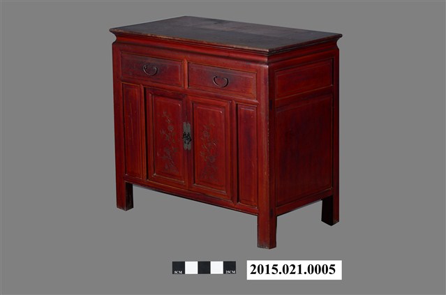 2. 本件外型方正,作工典雅簡樸,櫃體通體施朱漆。頂部以長方形厚木板為櫃面,可兼作桌面使用,桌面下方以墨線及幾何紋環繞裝飾。櫃體上方有單層2只中型抽屜可供儲物,抽屜面板中央附有蝴蝶形匙孔及U型屜環,左右兩側墨繪花草紋與回紋環繞裝飾。抽屜之下作單層3只小板堵,無功能,板堵邊框帶起線,表面墨繪花藍圖紋,象徵青春與辟邪(簡榮聰2000:138)。櫃體左右兩側面亦以墨櫃盆景與瓶花圖紋,象徵平安富貴之意(簡榮聰2000:135)。櫃體下半部敞空,僅有4只方柱形支腳,正面及左右兩側支腳間有橫桿固定支撐,櫃體背面無上漆與裝飾。