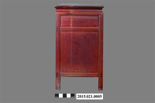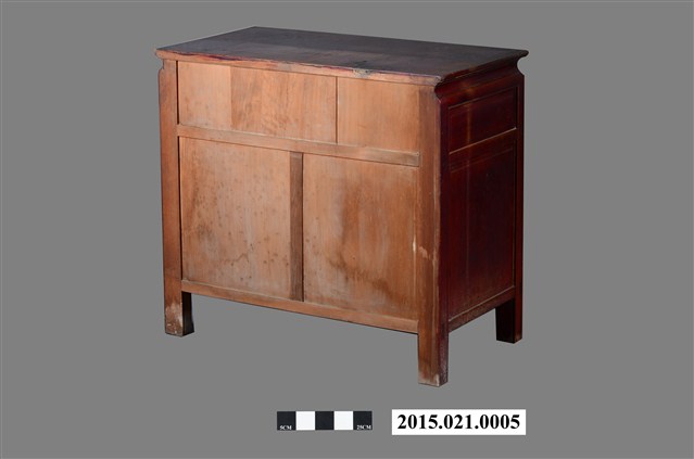 1. 本件根據捐贈者描述,為母親張周好女士(1913-1992,臺中后里人) 20歲1932年結婚時娘家所附之嫁妝家具之一。主要作為客廳或書房桌櫃,桌面放置物品,抽屜儲存文件或小物。