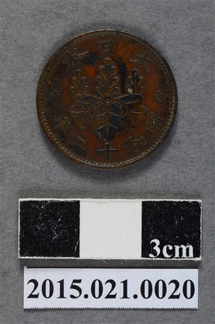 2. 依據袁穎生(2001)之研究,日治時期臺灣輸入大量日本貨幣,包括紙幣、銀幣、銀輔幣及銅幣,1937年太平洋戰爭爆發後,鑄幣金屬來源逐漸匱乏,1938年後又陸續鑄造價值較低的鎳幣及鋁幣。本件為1937(昭和12)年所發行之一錢硬幣,品質尚佳,銅幣成份應還維持在銅98%、錫與亞鉛各1%之比例。1938年後所發行之一錢銅幣改為銅90%、亞鉛10%,品質下降許多。