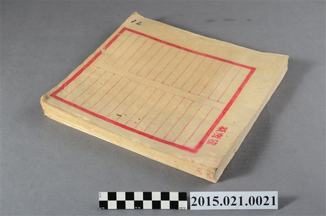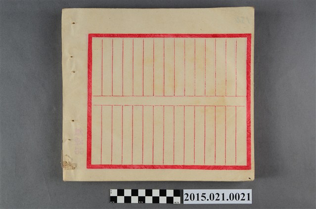 1. 本件為大型棉紙帳簿,外形近似正方形,封皮已遺失,僅存內頁,線裝裝訂。每頁印刷紅色格線,直式15行,分上下兩列,另單數頁右下內側加印有「鎰源GG」商號字樣,內容空白無書寫。 2. 本件於捐贈者母親嫁妝桌櫃抽屜內之發現物,推測鎰源賬簿為日治時期商號理事或書記常用之賬簿品牌。