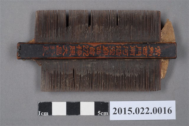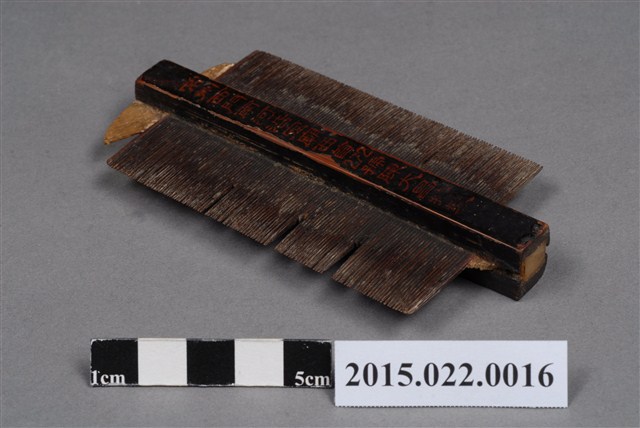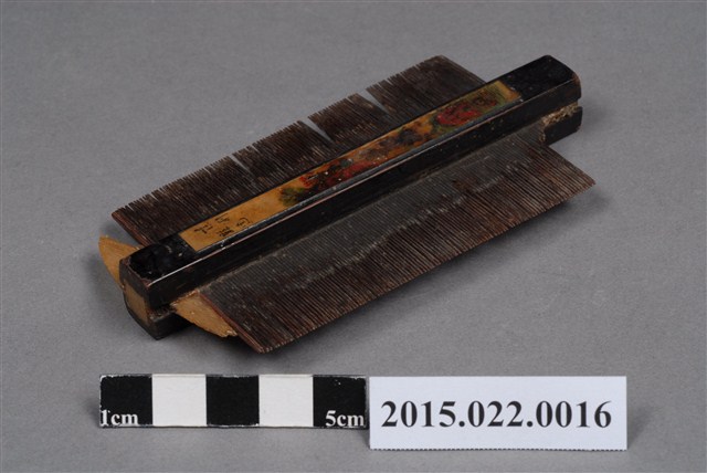 樑正面有圖繪,背面寫有「常州西門南河沿宏廟西首272號陳大昌特製」。江蘇常州自清乾隆以來就是江南地區知名的蓖梳製造販賣中心,尤以西門外的蓖箕街最為知名。這把篦梳為臺北大稻埕經營寶藏興銀樓的王師三家族捐贈,推估為清末到日治初期購置使用。
