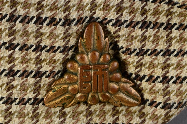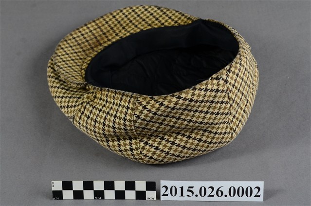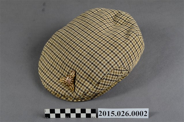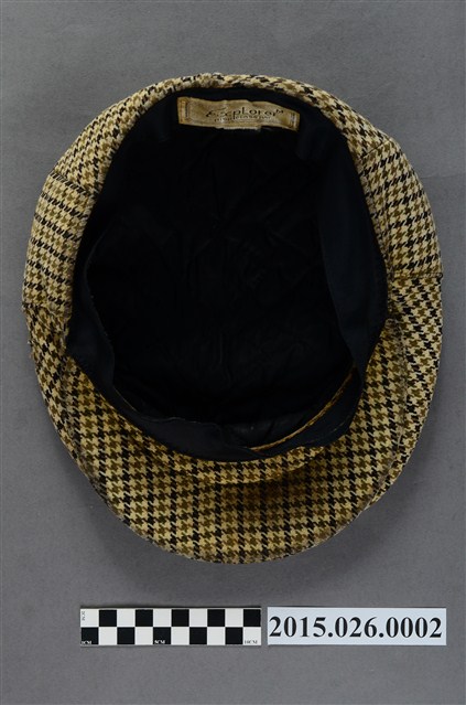 2. 本件為扁帽,羊毛材質,外側為深淺褐色交錯形之千鳥方格紋,內襯為黑色絲質襯裡。內襯腦後縫有服飾品牌的標籤,其上有「Explorer M HIGH CLASS HAT」等字。EXPLORER(探險家)為中國戶外生活用品品牌,專營露營、登山、潛水、溯溪、野炊、烤肉、旅遊品等專賣。帽子外前側有黃則修先生自己加別的三角形徽章,因黃則修先生於1936年考入北師附小,後直升師範部,歷經二戰,於1949年畢業。推測此為台灣總督府台北師範學校之徽章。