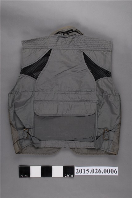 1. 本件為「臺灣攝影獨行俠」黃則修先生(1930-2014)約中晚年時期平時外出攝影或釣魚常穿的背心,背心為深墨綠色,立領、前開對襟、無袖。背心正面右襟有3只鈕扣型口袋,左襟亦有2只拉鍊式及1只鈕扣型口袋,部分口袋邊緣或外側附有吊環或筆插,後背下方亦有一只大口袋,此種多口袋背心相當受到攝影者或釣魚人士喜愛,小口袋可存放底片、測光錶、魚鉤、釣餌、或其他小工具,方便隨時拿取使用,背面大口袋可放置雨衣。背心內裡為黑色網狀布,便於排汗散熱透氣,近衣領處縫有服飾品牌標籤,印有「Jack Wolfskin M」等字。本件材質較為厚重,推測為秋冬背心。