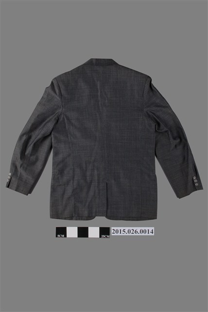 1. 本件為「臺灣攝影獨行俠」黃則修先生(1930-2014)約中晚年時期出席正式場合(例如攝影展、記者會等)之西裝外套,鐵灰色、前開對襟、長袖。外套左右各有1口袋,質料較薄,為夏季西裝。內裡近領口處為咖啡色絲質布料,左胸襟內有一暗袋夾層,暗袋上方縫有服飾製作商「瑞興西裝社 Tailor 台北新生南路一段一七三號 Mr.」標籤,標籤中央Mr.後空白處以紅線繡「黃則修」三字。