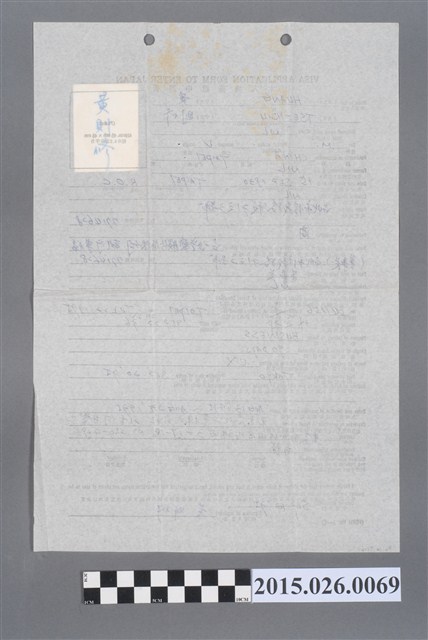 1. 本件為黃則修於民國64(1975)年9月12日赴日時向日本駐香港領事館所提交之入境簽證申請書。文件為制式日文表格印刷文字,由申請者填寫個人資料與赴日目地說明等資訊,申請書右上方貼有黃則修2吋黑白大頭照。