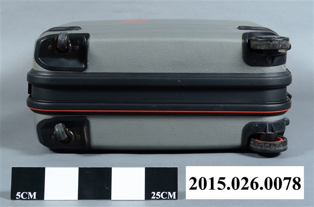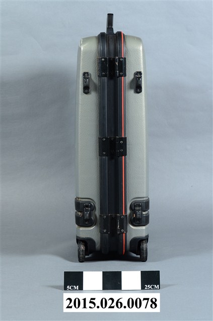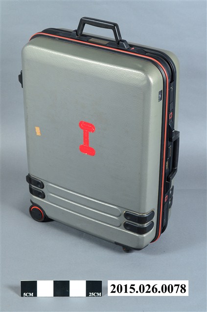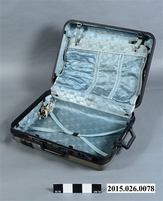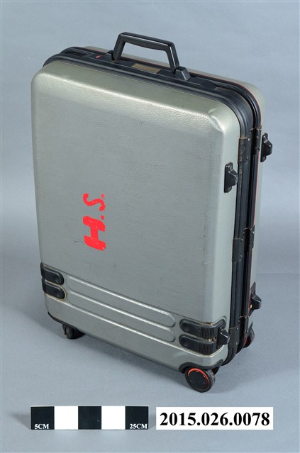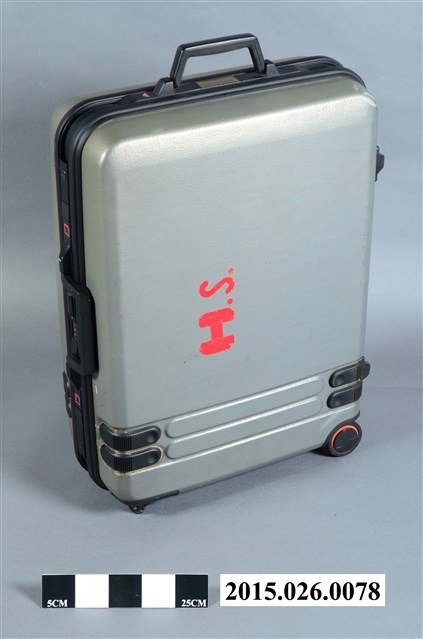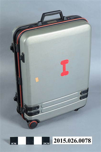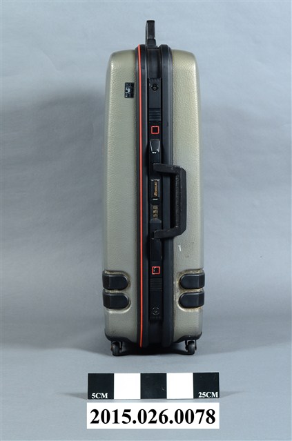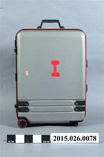 1. 根據家屬描述,本件為「臺灣攝影獨行俠」黃則修先生(1930-2014)民國70年左右常用之行李箱,外側貼有「H.S.」、「I」螢光橘色字母貼紙,另有一張「中正國際機場出境行李X光儀查緝」泛黃小貼紙。行李箱廠牌為愛可樂(Echolac),黃褐色長方形,ABS塑膠硬殼材質,可直立與橫向手提,直立時底部附有4只隱藏式滑輪,方便使用者拉行。行李箱採號碼鎖設計,使用者可自行設定密碼。