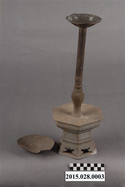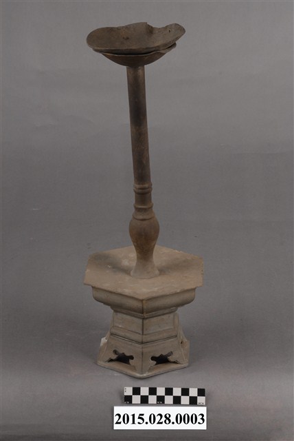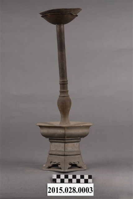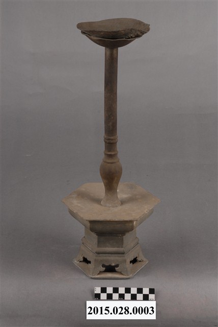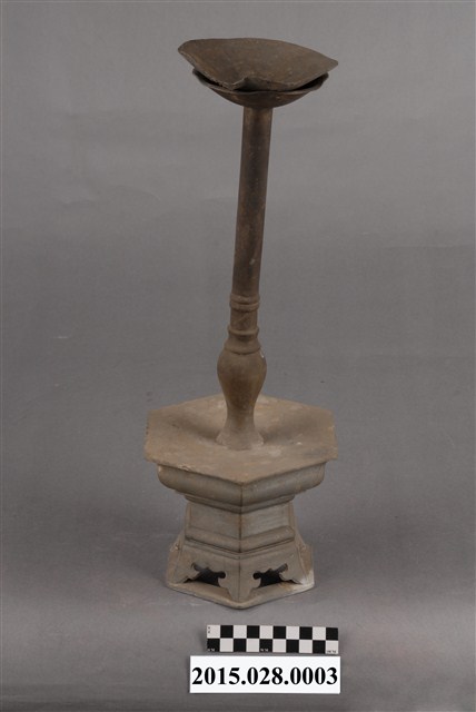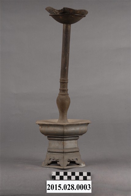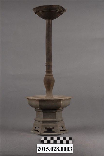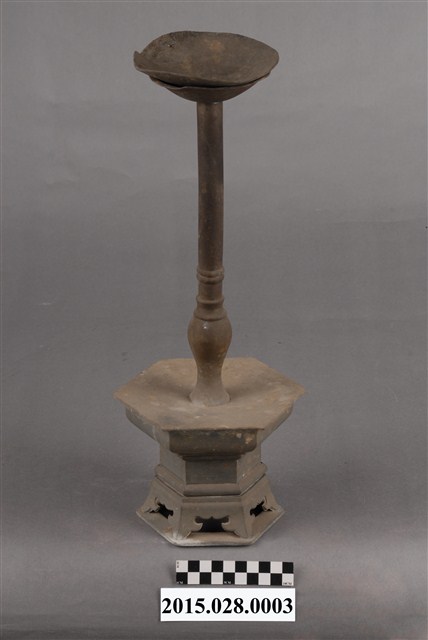 油盞樣式多樣,材料有陶瓷、銅、錫和合金居多,本次捐贈標的為錫製油盞,上方置一油燈碟,再碟上倒入菜仔油或臭油,拉條棉繩到碟子邊緣點燃即成簡易燈具使用。