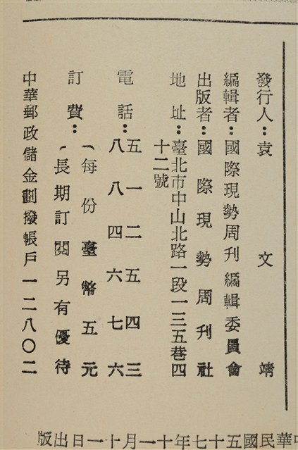 此雜誌為戒嚴時期的報導國際現勢之周刊。封面為美國新任總統尼克森,內容為尼克森當選美國總統後情勢,捷克與蘇俄分裂捷克計畫等。