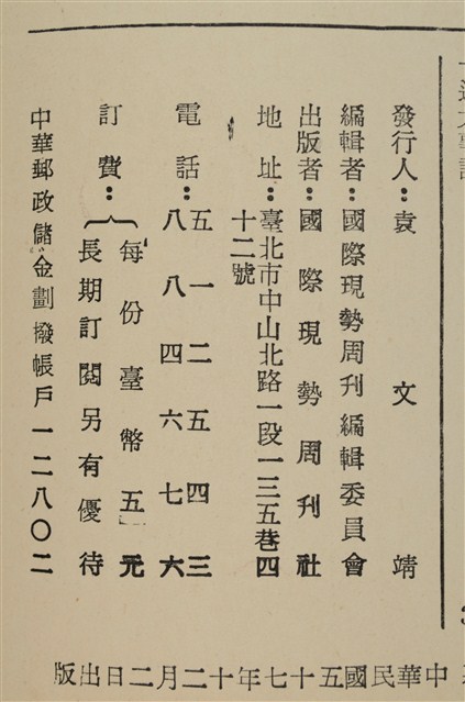 此雜誌為戒嚴時期的報導國際現勢之周刊。封面為戴高樂主義夢已成空,內容討論法郎與法國之危機等。
