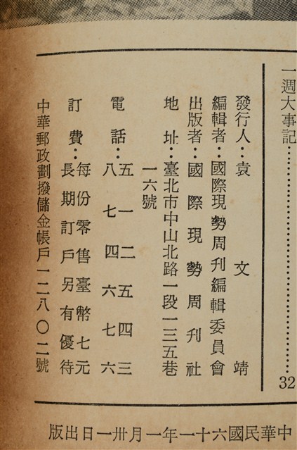此雜誌為戒嚴時期的報導國際現勢之周刊。封面為英首相加入歐洲共同市場,內容為美國總統尼克森的國情咨文演說全文,寮共軍,日本向俄國要求收回北部領土等。