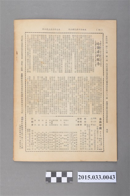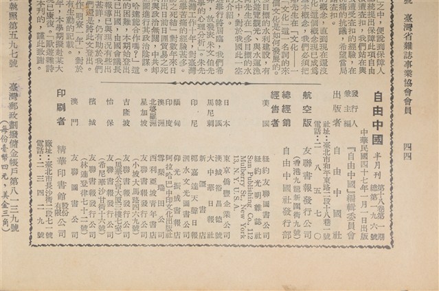 (二)北大首長會議的決定及其影響 社論 本刊(三)行政院長應不應到監察院報告備詢 社論 本刊(四)彈劾案與調查權 社論 本刊(五)為「政治」半月刊橫遭查扣而抗議 社論 本刊文化-一個名詞的滄桑 徐道鄰多目標的水庫之發軔-石門水庫 宋希尚執政黨控制臺灣地方選舉的心理分析 朱文伯日匪貿易之死結 王沿津蘇嘉諾、哈達能合作嗎? 通訊 葛偕吾明寮一年 雷震歐遊雜詩二首 李經(一)異哉所謂安全主任 讀者投書 謝琇如(二)為永久性的臨時雇員說一句話 讀者投書 林合源