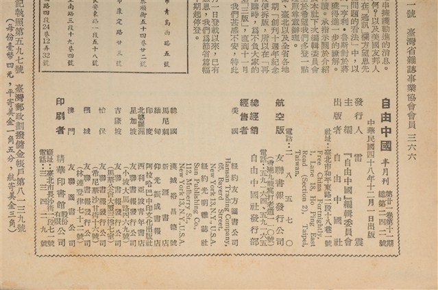 半月大事記,本刊,(一)開倒車,本刊,(二)政府豈可趁「災」加價?本刊,(三)請速停辦「大陸來臺國民調查」!「容忍與自由」,胡適講; 楊欣泉記,國際局勢與反攻復國之道,金思愷,正視第五次電力加價問題,陳式銳,赫魯雪夫治下的蘇俄(下),Harrison E. Salisbury著; 董鼎山,摘譯,請重視海外對總統連任問題的看法,方望思,西德總統的選舉,姜懷平,英國大選以後,紀夢平,江湖行(十二續),徐訏,西雅圖的秋天,叢甦,有關拙文的勘誤和說明,沈雲龍,亨利.魯斯對於蔣總統連任所暗示的意見,桑明,給讀者的報告,本刊。(陳亭靜撰文,陳怡宏校正)