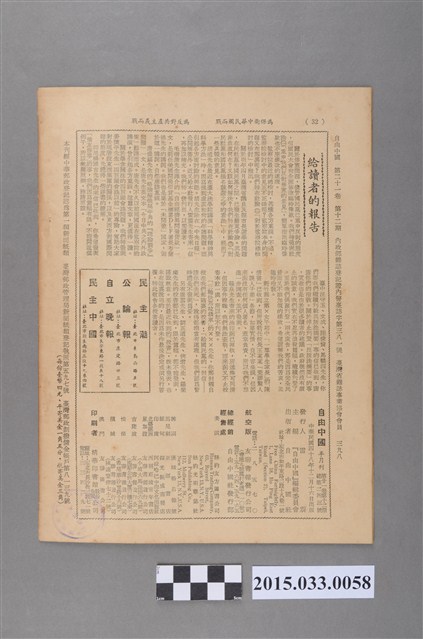 半月大事記,本刊,(一)重申我們反對修憲的意見,本刊,(二)對於監察院總檢討的檢討,本刊,(三)對民社黨和國民黨提名競選之爭的看法,本刊,虛雲和尚年譜討論,胡適,自由經濟與開發貸款,Vance Brand 講; 毛樹清 譯,略論蘇俄與中共的「理論競爭」問題,唐盛鎬,(一)我們懂得「軍」與「家」,蕭人鑑,四巨頭會談以前,姜懷平,我對印度中共邊界糾紛的看法,佘陽,懂了,原來「帽子」是扣上去的!本刊特約通訊記者,劉富蘭,(二)對「教職員婚喪互助辦法」的意見,王明生,江湖行(十三續),徐訏,介紹一本值得當代青年一讀的書,胡虛一,(三)請聽我們的控訴!一群三軍官校停訓生,(四)誰是包庇臺北市城東供銷場大違建的幕後人物?甘火文,給讀者的報告,本刊。(陳亭靜撰文,陳怡宏校正)
