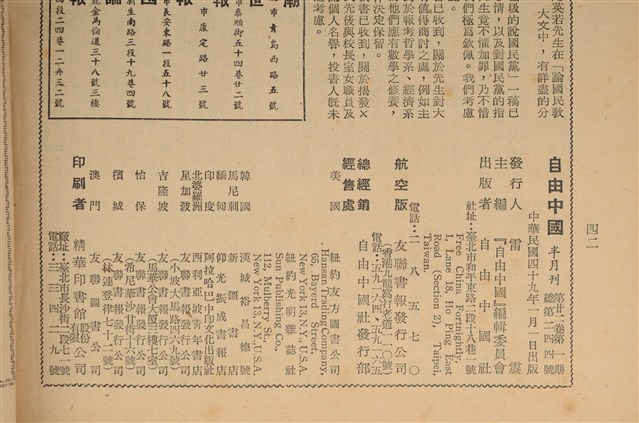 半月大事記,本刊,藉團結以打開政治新局面,本刊,┌死亡宣告┘可以適用於國大代表嗎?本刊,康隆報告的實質及其根本錯誤,本刊,民選省長此其時矣!郭雨新,最近年來的美國最高法院,劉慶瑞,曹操的改造,東方既白,從巴黎四國高層會決議看未來世局,宋文明,一個軍人對『以軍為家運動』的看法,丘仲言,論國民教育及其課業的加重與減輕,趙英若,新年初論美國總統競選,董鼎山,『仍有商討餘地』的『三民主義學術獎金』,黃少友,如此的『偉大試驗』,劉富蘭,牛皮紙的包裹,思果,江湖行(十四續),徐 訐,從臺大講師慘死說到警務處李葆初的措置,林 醒,國大代表不該為自己『名』『利』打算!蘇 子 飛,一個教育人員子弟給劉廳長的信,『自由中國』一讀者,給讀者的報告,本刊。(陳亭靜撰文,陳怡宏校正)