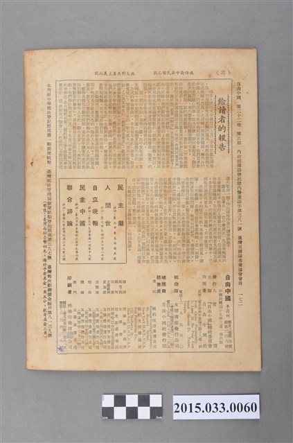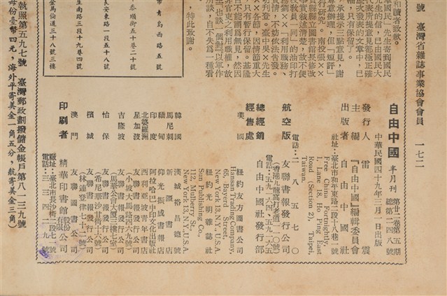 (一)不要再玩政治魔術!-告國民黨當局,本刊,(二)豈容「御用」大法官濫用南景釋權?本刊,我們對毀憲策動者的警告,左舜生 張君勵 張發奎 李璜等,另一式的修改憲法,夏濤聲,修憲、毀憲與責任,朱文伯,敬向國大代表同仁說幾句話,雷震,幾點國是意見,王厚生,主義與政治,陳咸森,接受過去兩次庚子年的教訓,金承藝,(一)望國大代表勿為國民黨所收買,陶心和,海外人士的十二點國是意見,方望思,看國民大會的明爭暗?!袁治本,烏煙瘴氣的政治活動在臺大!極光,推銷員的精神,邢公倜,一粒灰塵,司馬中原,(二)再談誰是包庇臺北市城東供銷場大違建的幕後人物?甘火文。(陳亭靜撰文,陳怡宏校正)