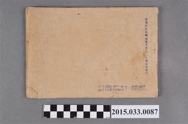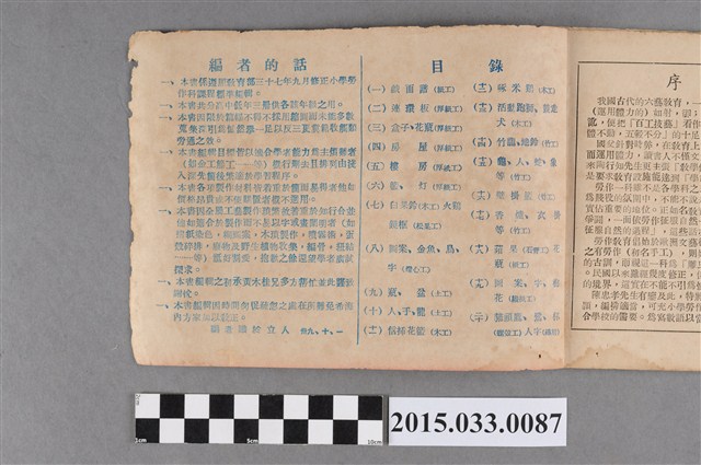 本版內容有第1課戲面譜(紙工)到第20課貓頭鷹、鷺、杯(螺殼工)人字(專刻)有臺灣省教育廳編審字第八二七號核准發行,及封面設計柴郎字樣(陳亭靜撰文,陳怡宏校正)