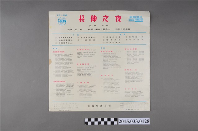 封面有抒情歌王長伸之夜的頭像,為彩色印刷,上方印有幸福唱片LUCKY RECORD,LY-159,下方則印有新歌兩首、夕陽落西山、秋風飄落葉,作曲牧童心,作詞白蕊。背面則是歌曲的歌詞。(陳亭靜撰文,陳怡宏校正)