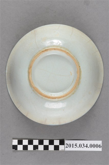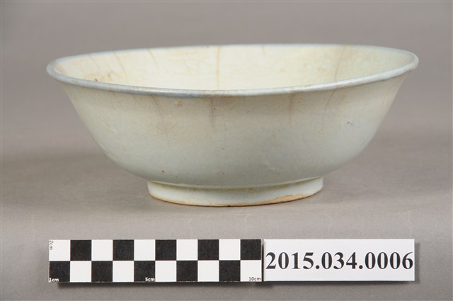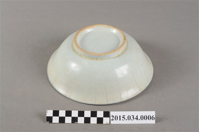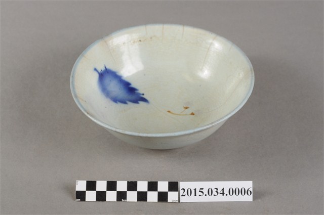 本件為捐贈者母親林凉女士戰後初期於臺南市開設自助餐小吃部時店內用的中型陶瓷湯碗或麵碗。湯碗以白釉為底,碗內壁噴寶藍色釉料,形成雙葉紋。口沿略帶藍釉,器底帶一矮圈足,碗壁內外有多處龜裂紋。