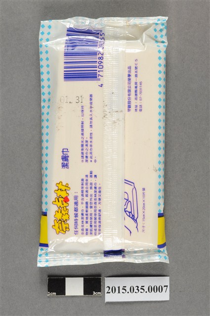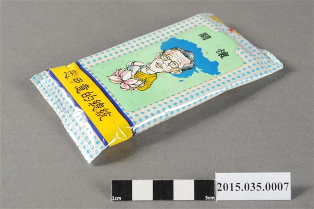 1. 本件為印有陳履安卡通圖樣1996年總統大選競選文宣潔膚巾,包裝完好,但內容物濕紙巾水份已蒸發殆盡。紙巾尺寸為15cmX20cm,10片裝小包裝,包裝正面貼有卡通人物造型陳履安穿著袈裟坐在蓮花上,背景為藍色的中國地圖,圖案上方有「關懷」二字,下方有「您甲意的總統」六字。包裝背面為濕紙巾使用說明及製造廠商資訊,製造商為琴觀股份有限公司,公司地址:高雄縣鳳屏一路5號C5,產品品名:奈森克林潔膚巾。2. 中華民國第九任總統、副總統選舉於1996年3月23日舉行,是中華民國建國以來第一次總統、副總統的公民直選,也是動員戡亂時期結束後的第一次總統、副總統選舉,為繼1993年新加坡總統選舉之後,華人地區第二個以直接選舉的方式產生國家元首。當屆選舉共有4組候選人參選,包括中國國民黨提名之李登輝與連戰,民主進步黨提名之彭明敏與謝長廷,以及以無黨籍名義參選之林洋港與郝柏村、陳履安與王清峰。當時執政的中國國民黨面臨部分黨員出走參選,以及中國台海飛彈危機的推波助瀾下,最終由中國國民黨提名的李登輝與連戰以76.04%之過半得票率當選,成為台灣首位民選的正、副總統。