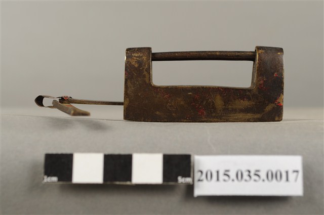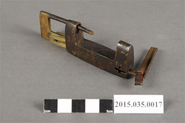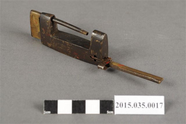 2. 本件外形呈長方形,類型屬鎖具中之廣鎖,為橫式鎖具,多用於鎖門、鎖櫃、鎖箱,組成的元件包括鎖體及鑰匙。鎖體提供鑰匙槽讓鑰匙插入並導引鎖栓移動上鎖時,鎖栓上張開的簧片將會撐開並抵住鎖體內壁,以防止鎖被打開;若要打開,必須插入鑰匙,使鑰匙頭擠壓簧片進而活動鎖栓。