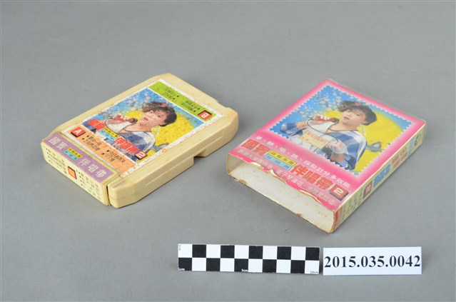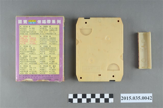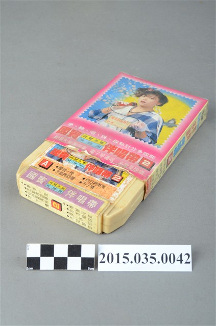 1. 國寶唱片出版社發行《國寶多重音聲雙頭用伴唱帶2》雙頭匣式錄音帶,配件包括匣式錄音帶1卷、外包裝紙盒1個、磁帶遮蓋1個。外包裝封面為一斜綁馬尾的女子,手持紅色麥克風歌唱彩色照。文宣標榜學、聽、唱、跳、採點計分多效能;新潮大樂隊伴奏,電子琴導唱,名歌星陪唱。出版登記:局版台音字第0600號。上寶企業有限公司製作,國寶唱片出版社發行,編曲指揮/紀明陽,演奏/新潮大樂團,錄音/佳聲錄音室。