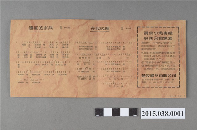 益友唱片公司出品余小魚「遠征的水兵」專輯唱片,宣傳1980年代音樂專輯,背面有〈遠征的水兵〉、〈在我心理〉簡譜。