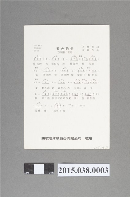 麗歌唱片出品,背面為〈藍色的愛〉(黃敏 作詞作曲)簡譜