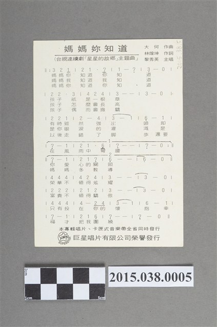 巨星唱片公司出品,背面印有〈媽媽妳知道〉(大何作曲、林煌坤作詞)簡譜。該專輯發行於1984年。