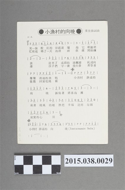 標示「東尼機構」、「東尼機構旗下巨星」,背面印有〈小漁村的向晚〉(葉佳修詞曲)簡譜