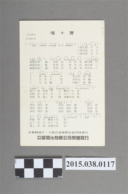 「金鐘巨星—蕭孋珠」,蕭孋珠為嘉義出身歌手,有番茄姑娘之稱。1974年至1990年發行多張專輯,早期以愛國、勵志歌曲為主,1984年獲頒第19屆金鐘獎最佳女歌手,之後在巨星唱片發表國臺語專輯。蕭孋珠自幼學習國樂,照片中彈古箏,背面印有〈嘆十聲〉簡譜,是一張具有中國傳統風情的專輯。