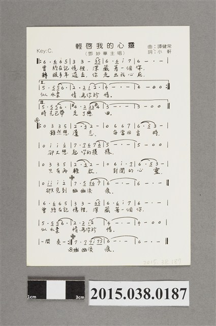 東尼機構印行唱片宣傳小卡,被面刊登〈輕啟我的心靈〉手寫簡譜。鄧妙華為新加坡出身歌手,1982年開視灌錄國語歌曲專輯,以"牽引"一曲成名,堪稱是來臺發展成功的第一個新加坡歌手。