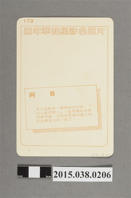 又名阿B,1970年代末到1980年代香港重要影星。背面註明他的外號為「花心查理第二」,查理是秦祥林。