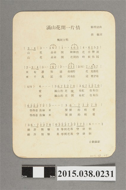 背面為〈滿山花開一片情〉(甄妮主唱)簡譜。林鳳嬌為1970年代知名電影演員,演出文藝愛情片居多。