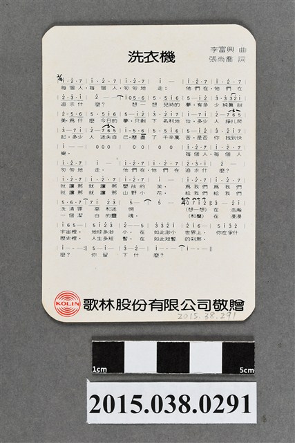 歌林股份有限公司印製「洗衣機」宣傳卡。背面為歌曲〈洗衣機〉簡譜。這首歌於1984年發行,為相當特別而知名的歌曲,。