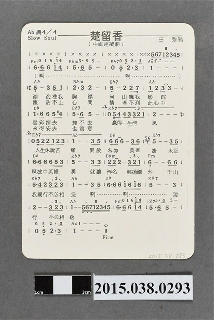港劇「楚留香」劇照,為劇中女性角色李紅袖扮相。背面為〈楚留香〉(中視連續劇,王強唱)簡譜。