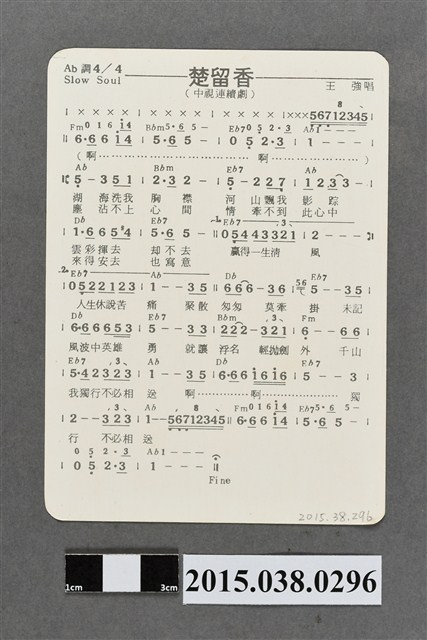 港劇「楚留香」劇照,為劇中女性角色黑珍珠扮相。背面為〈楚留香〉(中視連續劇,王強唱)簡譜。