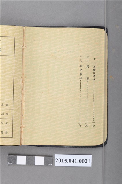 邱如淵先生公務人員手冊(台銓字第002496號)。 從冊內「考績及考成」項內的紀錄,登記了邱如淵先生從43年度到47年度間的考績資料,當時任職於臺南航空檢疫所,年功俸自245元升至260元。