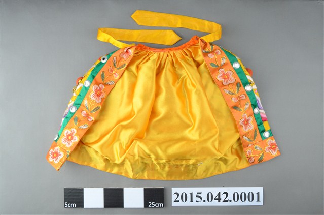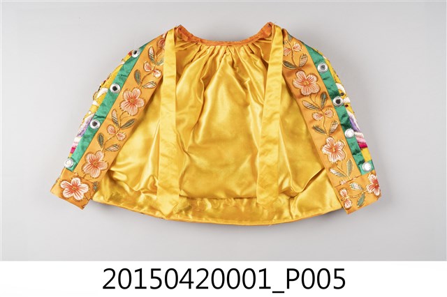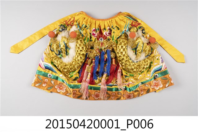 1.本件手工刺繡黃色神衣,1尺2,圖案為「雙龍護塔」,適用於1尺3寸半神像穿著使用,為府城光彩繡莊林玉泉所製作,未曾使用過。底布為素面黃色繡地,為主要的繡心,將雙龍及三層佛塔圖案舖棉浮紮,再以金蔥線縫製,做出立體浮凸的效果,周圍則以平繡、電繡的方式繡出花紋、江水紋,最後裝飾以流蘇、亮片等,呈現出神衣的華麗與莊嚴。繡邊採綠色、橘色雙色滾邊。綠色繡邊,窄邊、直接縫製於繡心外,繡有玻璃亮片,燈光照射時會反射,產生閃閃動人的效果。橘色繡邊,寬邊、最外層滾邊,上繡有花紋。盤龍的部分則是以6條金蔥線為一束縫製,龍爪為五爪。反面裡布則為素面黃色。