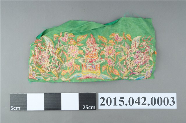 1.本件手工刺繡綠色神衣繡片,7寸半,為半成品、神衣之繡心,圖案為「雙龍護塔」,適用於關公神像穿著使用,為府城光彩繡莊林玉泉所製作。底布為素面綠色繡地,將雙龍舖棉浮紮,再以金蔥線縫製,做出立體浮凸的效果,龍麟的部分是以5條金蔥線為一束縫製,龍爪為四爪,塔身為二層,周圍再以平繡、電繡的方式繡出花紋、江水紋。
