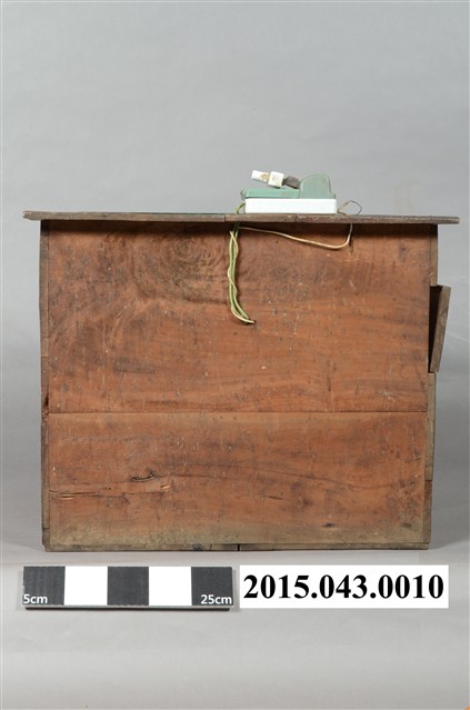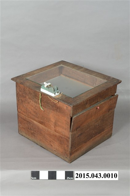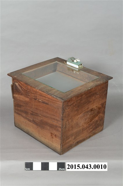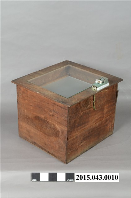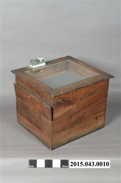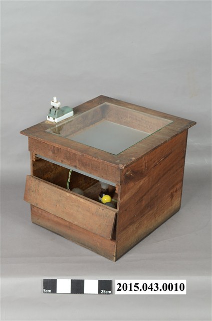 1. 本件根據捐贈者涂寬裕先生描述,採集自臺南市康樂街南北照相館,為照片印相箱(或稱印樣箱)。該店老東家於日治時期在日本攝影師開設之寫真館擔任學徒,二戰後居住於臺灣的日僑被迫返回日本,日籍攝影師父將寫真館帶不走的攝影暗房器材留在臺灣,戰後由臺灣徒弟繼續接手照相館之營運,因此該店中保留部分當時所留下的暗房器材。此物推測可能為日本時代日籍攝影師父所留之物,並於戰後持續使用,電器部分可能後來有重新修繕與改良。