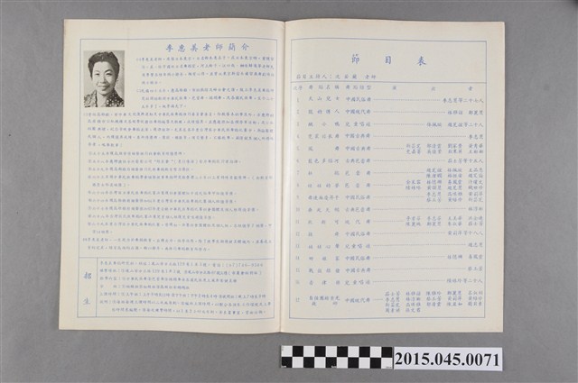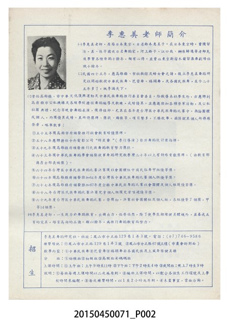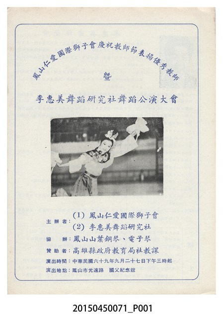主辦單位:高雄縣政府教育局,演出單位:李惠美舞蹈研究社,演出地點:鳳山市光遠路國父紀念館,演出時間:中華民國七十年十一月十二日。