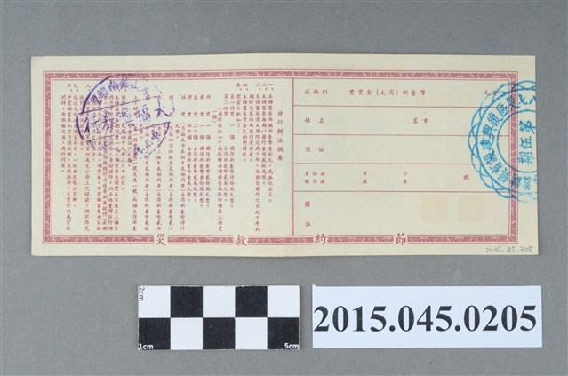 八七災區復興建設有獎儲蓄券(第伍期) 1959年8月7日起連續數日,臺灣苗栗以南至高雄地區,出現60年來前所未見的狂風暴雨,以致整個中南部陷入嚴重的水患中,災情慘重,鐵公路全面癱瘓,災民多達數十萬人,此自然災害被稱為「八七水災」,而此儲蓄券則是政府為了籌措重建災區經費。
