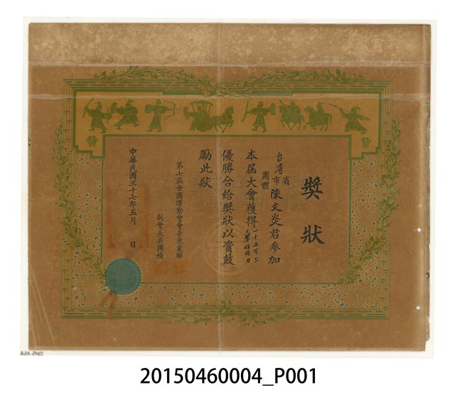 本件文物為1948年陳文炎先生代表台灣省,參加中國第七屆全國運動大會一千五百公尺異程接力賽之優勝獎狀。第七屆全國運動大會依規定原應於1937年於南京市舉行,但因中日戰爭,全國運動會停頓13年,戰後終在上海市舉行,參加單位遍及海內外,包括華僑與全國路海空勤警等單位,這也是戰後臺灣首次以台灣省名義參加全國運動會。