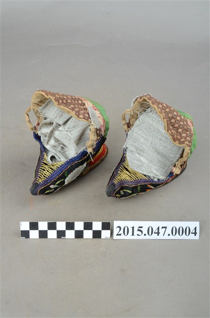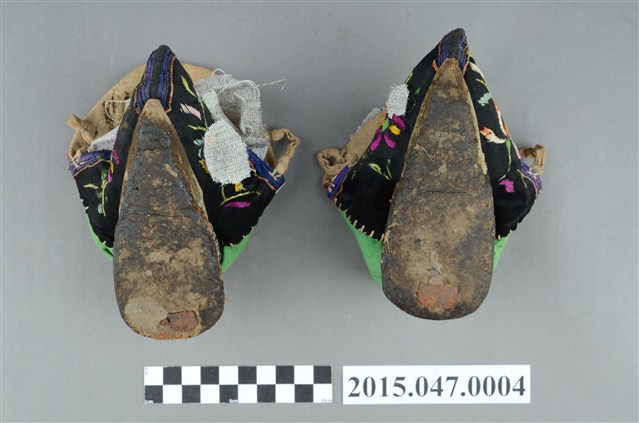2. 本件三寸金蓮,鞋底長9cm,高3cm。鞋子全長14cm,最高16cm。鞋頭呈尖狀,鞋幫由兩片黑棉布合攏而成,側面以彩色繡線繡花草紋圖案裝飾,鞋跟上方延伸為襪布,以草綠、粉紅棉布及彩色印花布拼縫而成。鞋底以棉布、草繩製成厚底與鞋跟,底面有明顯穿用磨損之痕跡。此種款式之三寸金蓮又稱尖口鞋,為清末民初流行之款式,由於鞋頭纖瘦尖凸,走路時只有鞋尖外露,看起來更覺得金蓮纖細小巧。